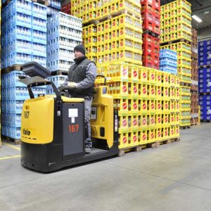 Transpaleta motorizada controlada por operario a pie con capacidad de elevación a baja altura para conseguir una menor fatiga del operario y una mayor productividad.